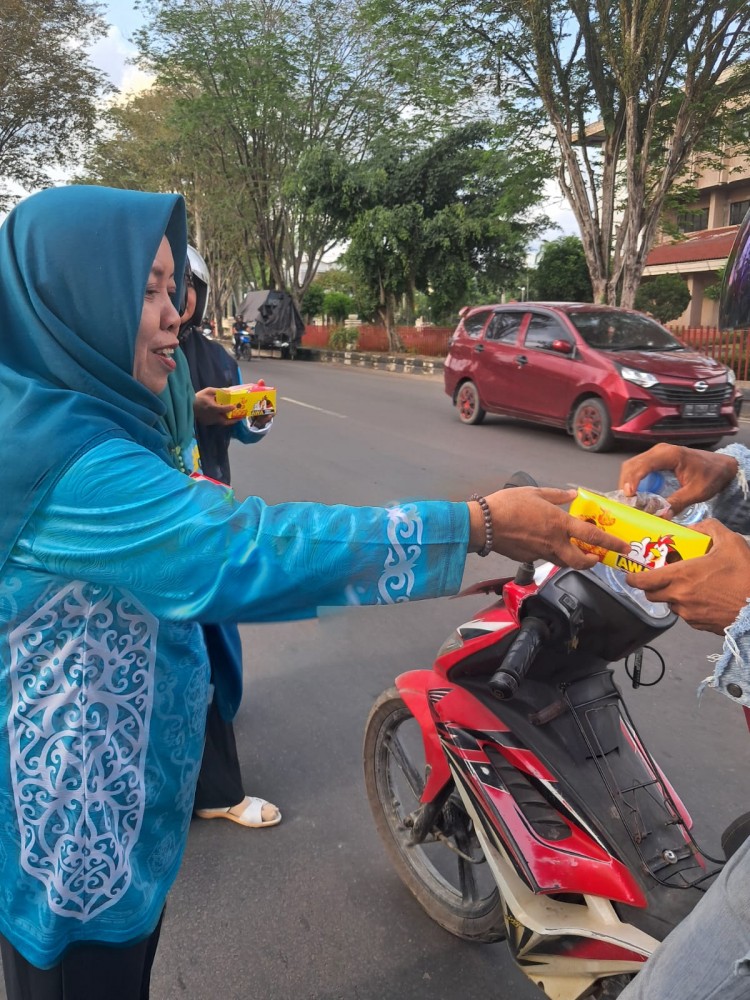 Ketua TP- PKK sedang membagikan takjil pada pengguna jalan.